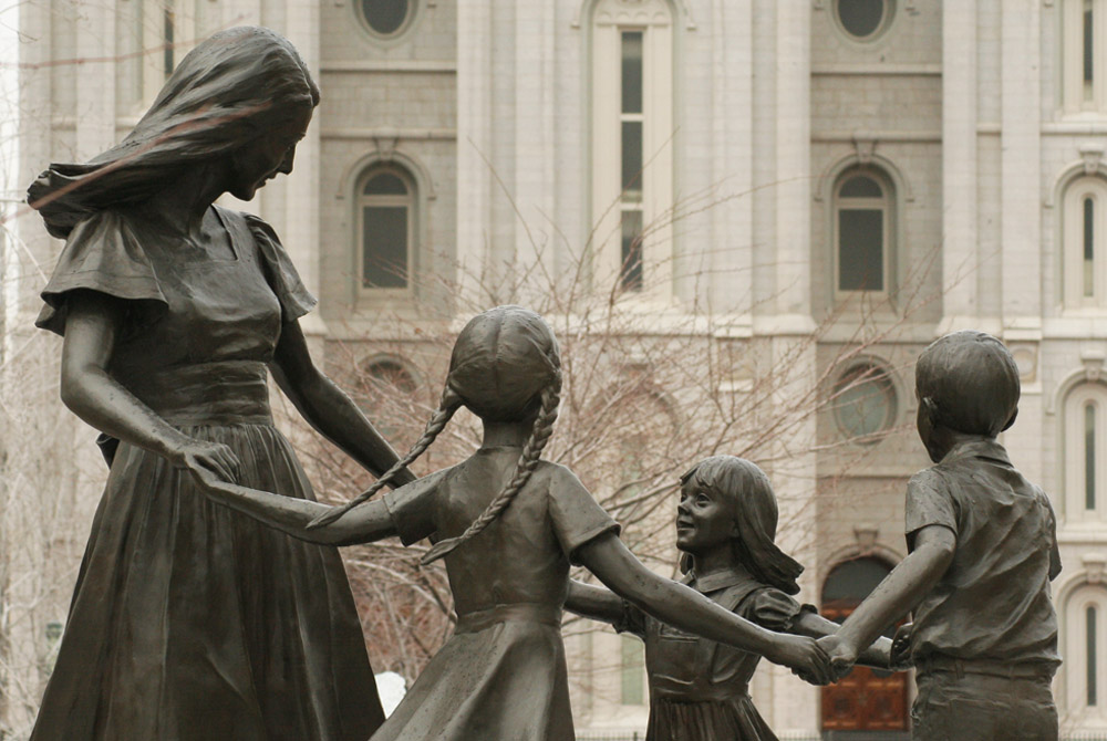 Statue celebrating the role of the mother in front of the Salt Lake Mormon Temple in Salt Lake City